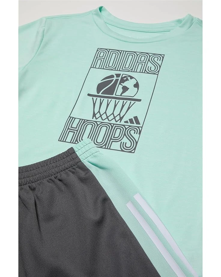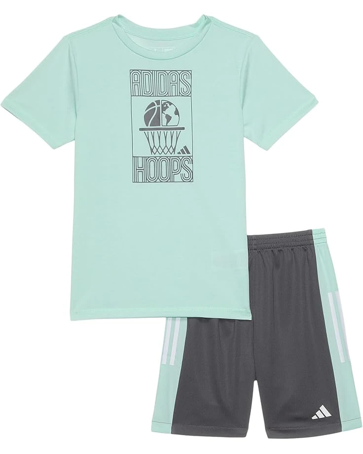 - The adidas® Kids 3S C Colorblock Short Set features a short sleeve tee with screen-printed art incorporating the adidas Performance Logo on the center front. Shorts feature contrast piecing on the side seam with screen printed floating three-stripes.