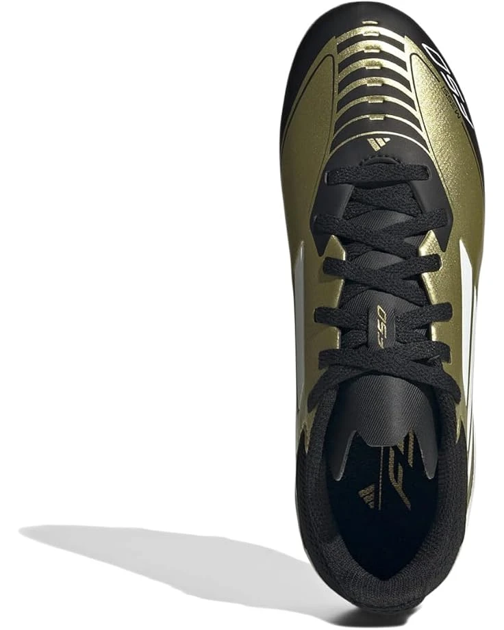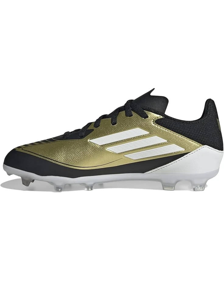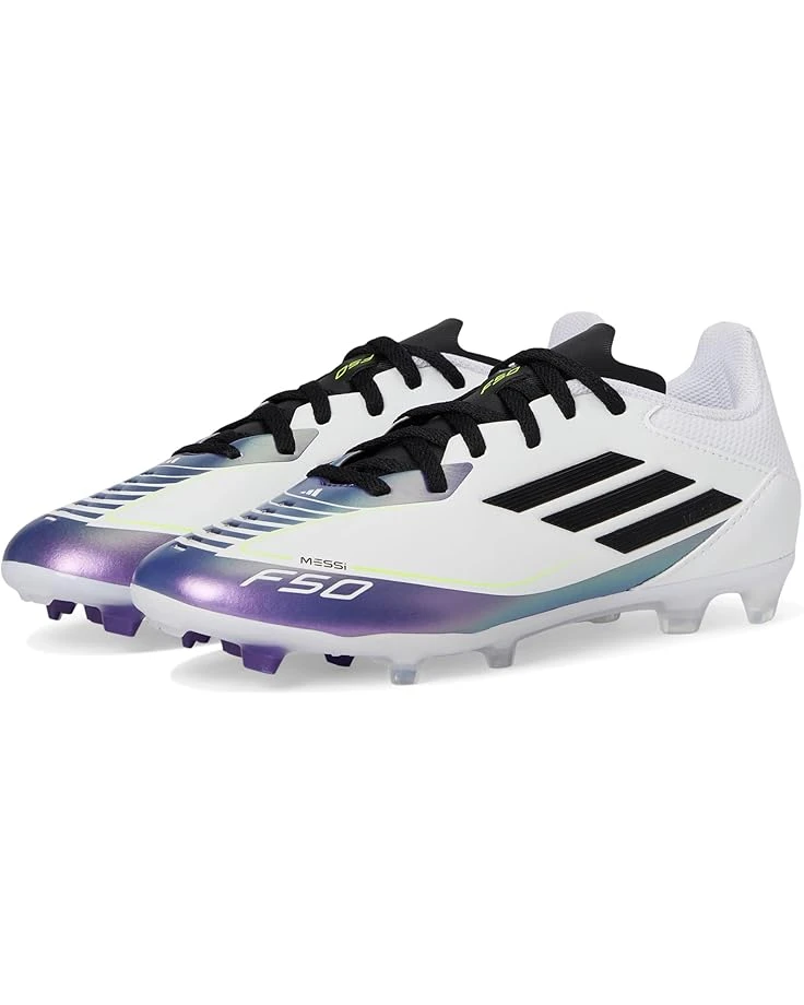 - Gear up for the next game in confidence and style wearing adidas® Kids F50 League Messi Football Boots Firm Ground Studs. The low-top sneakers come in a regular fit with a faux leather upper with lace-up design, textile lining, and cushioned rubber insole. The three-stripe branding on the studs gives the studs a chic appeal.