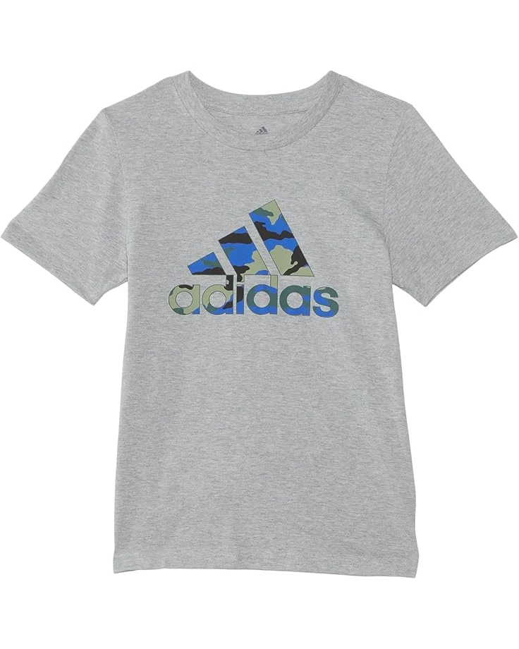 - Give your little one the ultimate combo of style and comfort in adidas® Kids Crafted with soft heathered jersey fabric, it’s a go-to for all-day wear. Featuring a regular fit that’s “just right,” this tee offers unrestricted movement while maintaining a sleek look. The trendy camo logo print adds a bold, sporty vibe, perfect for school, play, or weekend adventures. Designed with a classic crew neck and short sleeves, it’s as easy to pull on as it is to love.