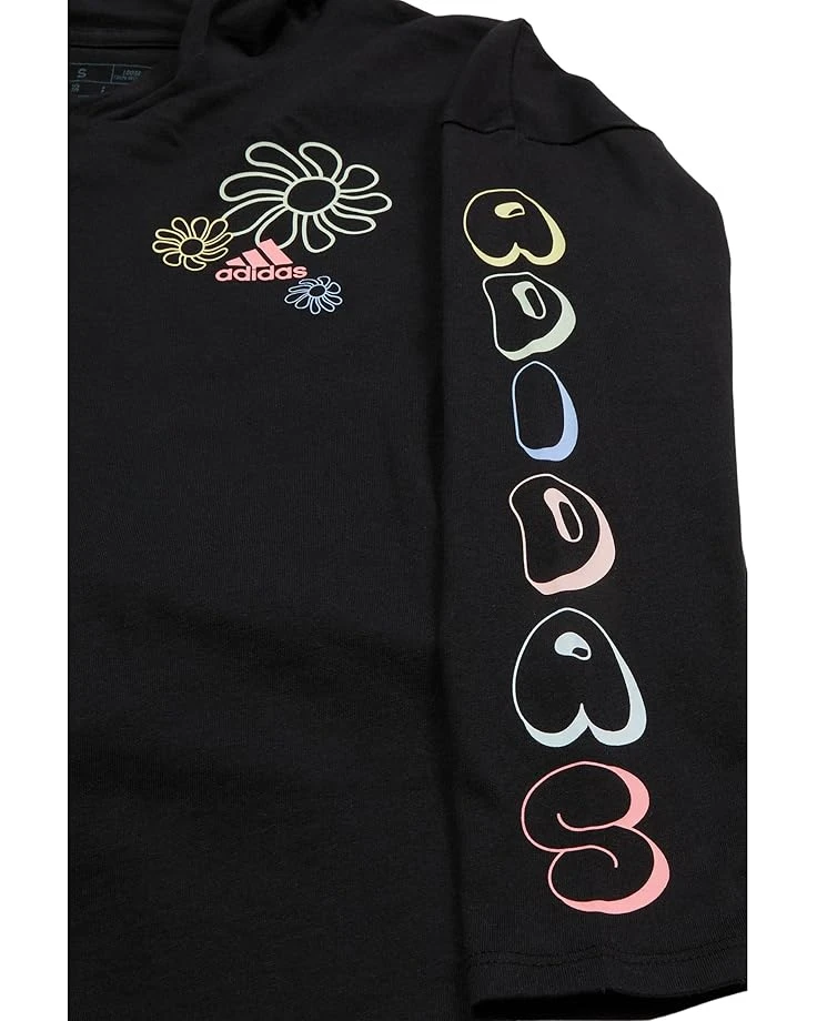 - Level up her everyday look when she wears this adidas® Kids Long Sleeve Hooded Graphic Tee. A vivid graphic makes it a step above basic. Plus, the soft cotton and roomy cut make it extra comfy. The loose-fit, waist-length tee features a hooded neck, long sleeves, brand logo detail on the chest, and a straight hem.